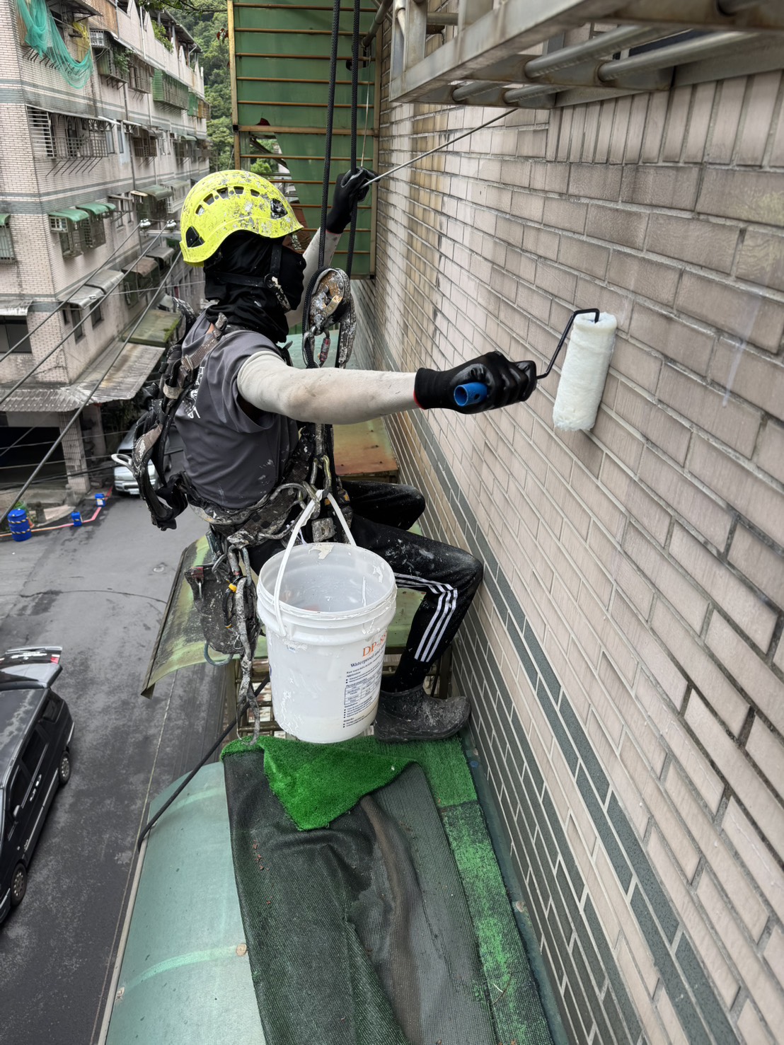 磁磚修補完成後,師傅開始進行防水漆施工。塗佈外牆專用底漆,以提升附著力並封閉水泥毛細孔;接著施作高彈性防水塗層,分兩至三次均勻塗佈,使防水膜緊密包覆整面牆體;針對窗框、牆角、接縫等高風險滲水區域,更額外加強處理,讓外牆具備更高的防水耐候能力。
