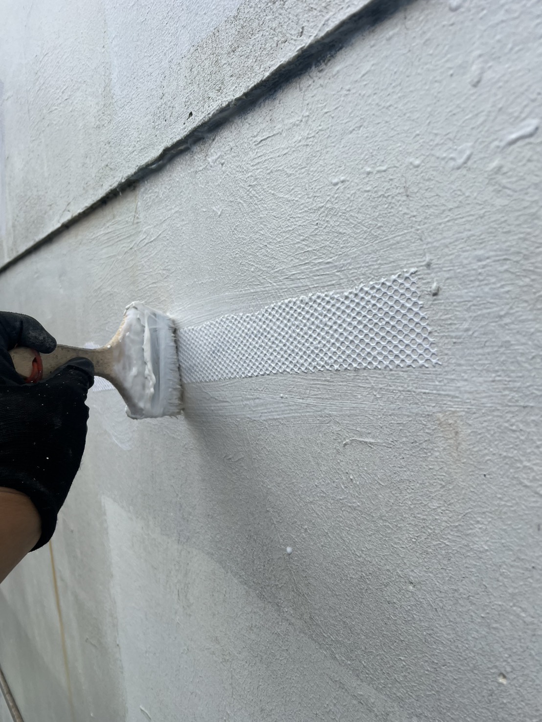 施工時,師傅先將龜裂周邊鬆動或老化的漆層清理乾淨,再針對裂縫進行補強與修補,讓牆面恢復平整與穩固。接著依照標準流程塗佈外牆防水漆,使防水材料能均勻覆蓋整面牆體,形成完整且具有彈性的防水保護層。