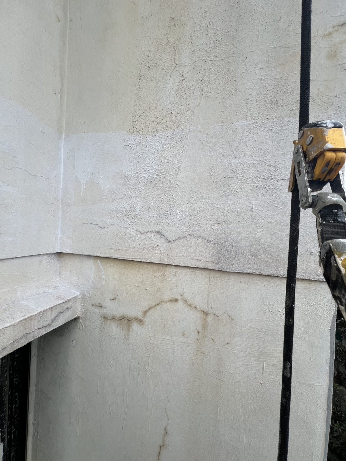 合發防水工程行進行外牆防水漆修補施工,因建築物外牆長期受到日曬雨淋與溫差變化影響,牆面逐漸出現細微龜裂。這些裂縫在平時不易察覺,但當遇到下雨時,雨水便會沿著龜裂滲入牆體,進而導致室內牆面出現潮濕、水痕甚至壁癌等問題,讓住戶長期感到困擾。