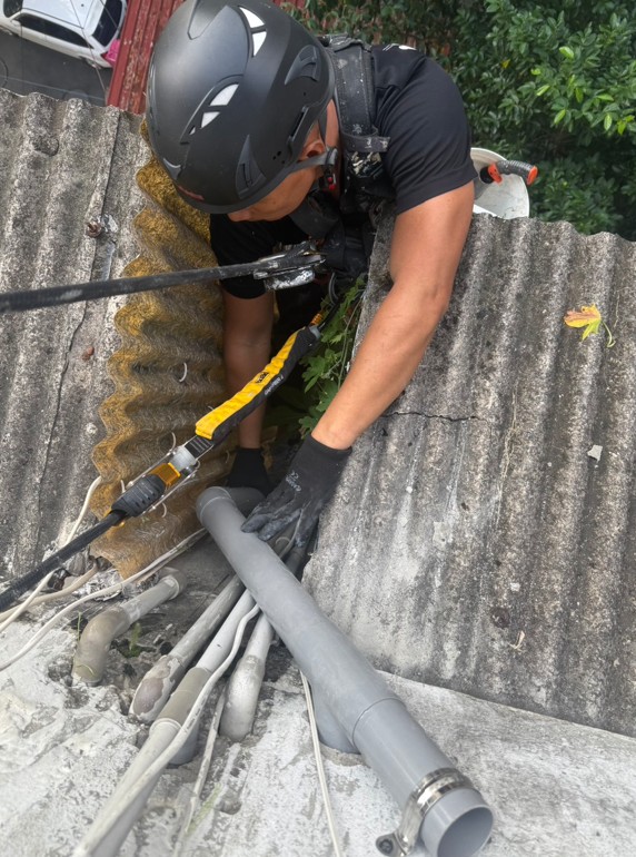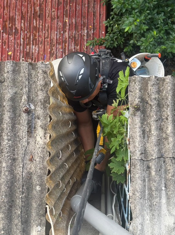 師傅們沿著外牆逐段檢查排水路徑,發現舊排水管已出現破洞、斷裂、堵塞與接頭鬆動的情況,部分排水甚至直接沿著牆面滑落,長期造成壁癌與磁磚鼓起。排水坡度不良、管件老化,也是造成大樓雨天「外牆淋水」的主因。