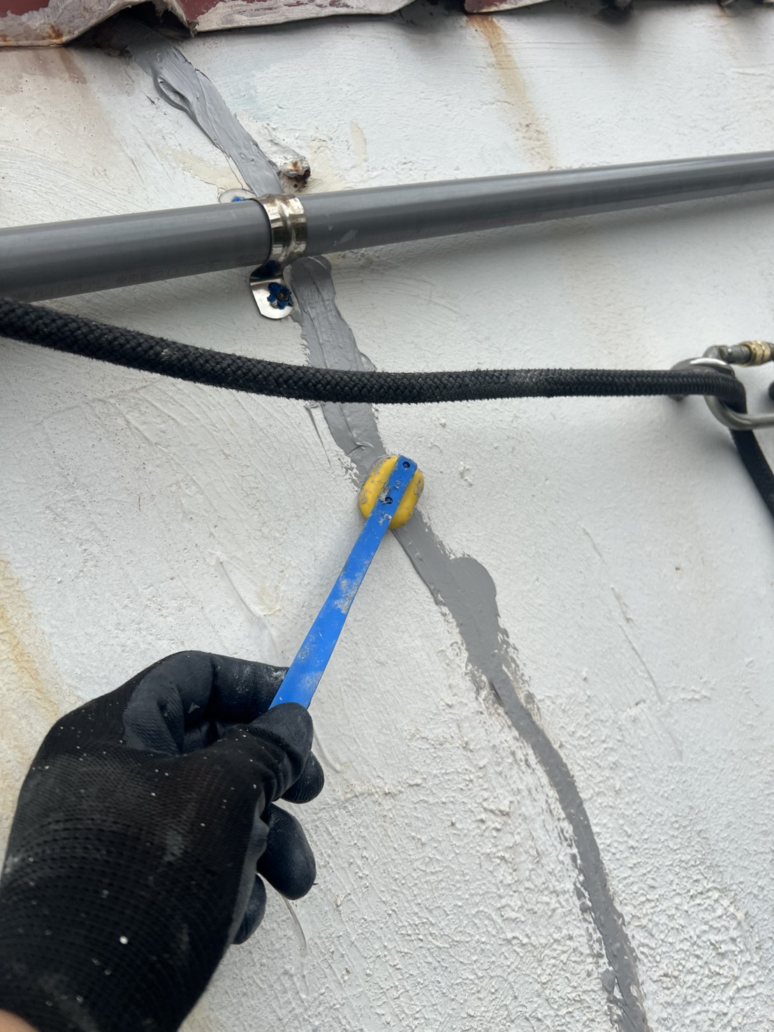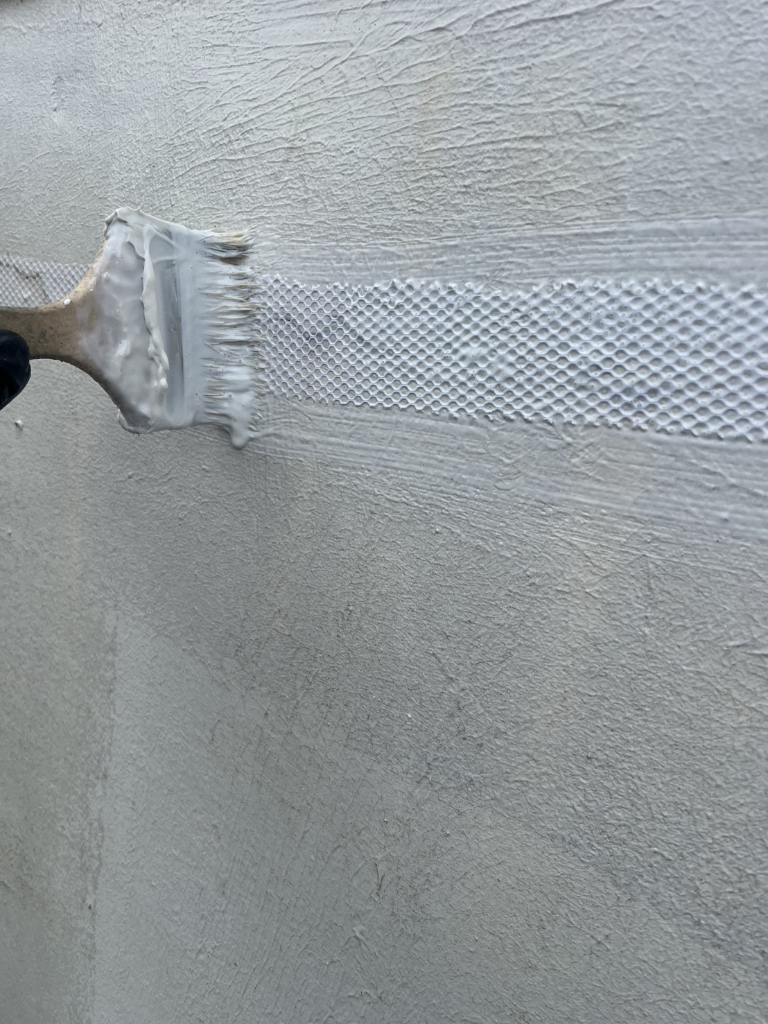 施工時,師傅先將龜裂周邊鬆動或老化的漆層清理乾淨,再針對裂縫進行補強與修補,讓牆面恢復平整與穩固。接著依照標準流程塗佈外牆防水漆,使防水材料能均勻覆蓋整面牆體,形成完整且具有彈性的防水保護層。